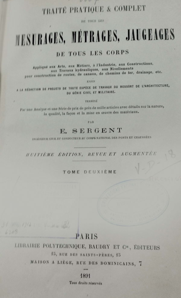 Traité Pratique et Complet de tous les Mesurages, Métrages, Jaugeages de tous les corps appliqué aux Arts, aux Métiers, à l'Industrie, aux Constructions, aux Travaux hydrauliques, aux Nivellements pour construction de routes, de canaux, de chemins de fer, drainage, etc. / par A.Sergent